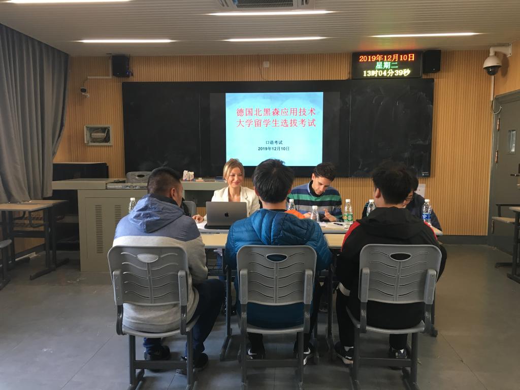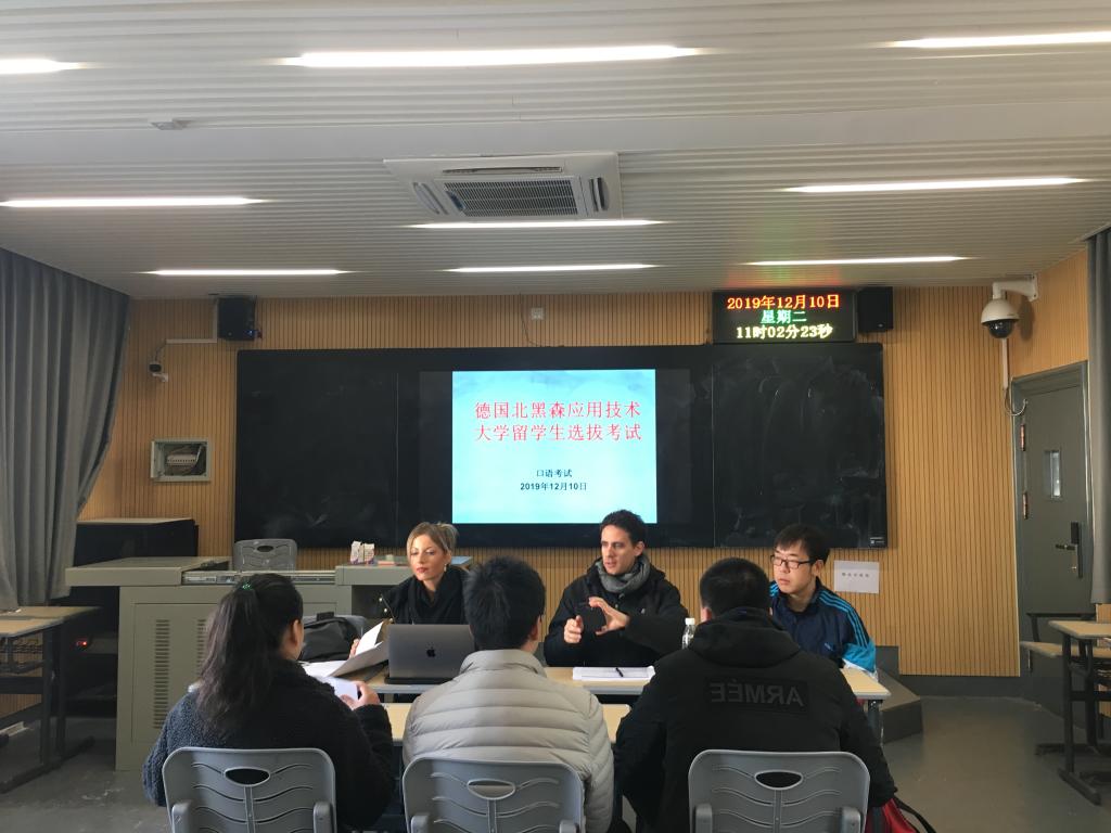 2019年12月10日,德国北黑森应用技术大学国际旅游管理&国际办公室主任Dr. Stefan Siehl教授和德国杜伊斯堡语言学校北黑森项目负责人Sanja Vidovic女士、德中教育文化交流协会北黑森应用技术大学项目助理程旭东老师一行3人来我院举行2020级留学生的入学考试,选拔考试在教学楼110、111中德教室顺利举行。