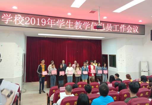 为表彰先进,杜丽茶副主任宣读了《关于表彰2018级优秀学生教学信息员的决定》(湘物院[2019]32号),陈建华副校长为优秀学生教学信息员颁发证书并合影留念。