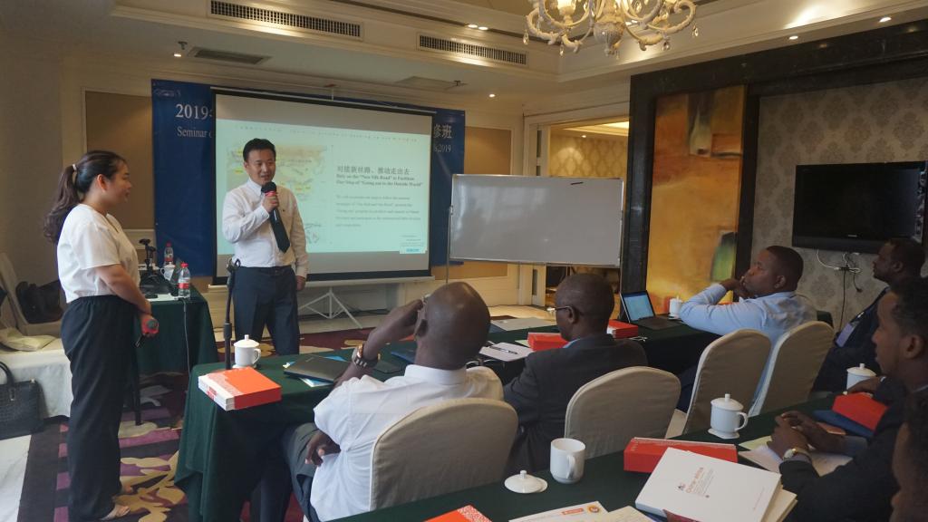 我校党委书记龙吟书记为此次研修班开讲第一课,介绍湖南省情和开放型经济发展情况。龙吟用流利的英语向研修班学员介绍了湖南省开放崛起战略的实施情况,并有针对性地介绍了今年6月在长沙成功举行的首届中国非洲经贸博览会的盛况以及索马里副总理古莱德先生率团参会情况。同时,还向来自索马里政府各部委的官员推介了华亿在线,希望今后学校能和索马里政府在物流行业人才培养和国际合作办学方面开展合作。
