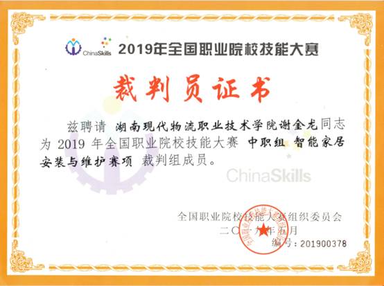我校物流信息学院谢金龙老师受竞赛执委会的邀请,参加了2019年全国职业院校技能大赛中职组“智能家居安装与维护”赛项的裁判工作。