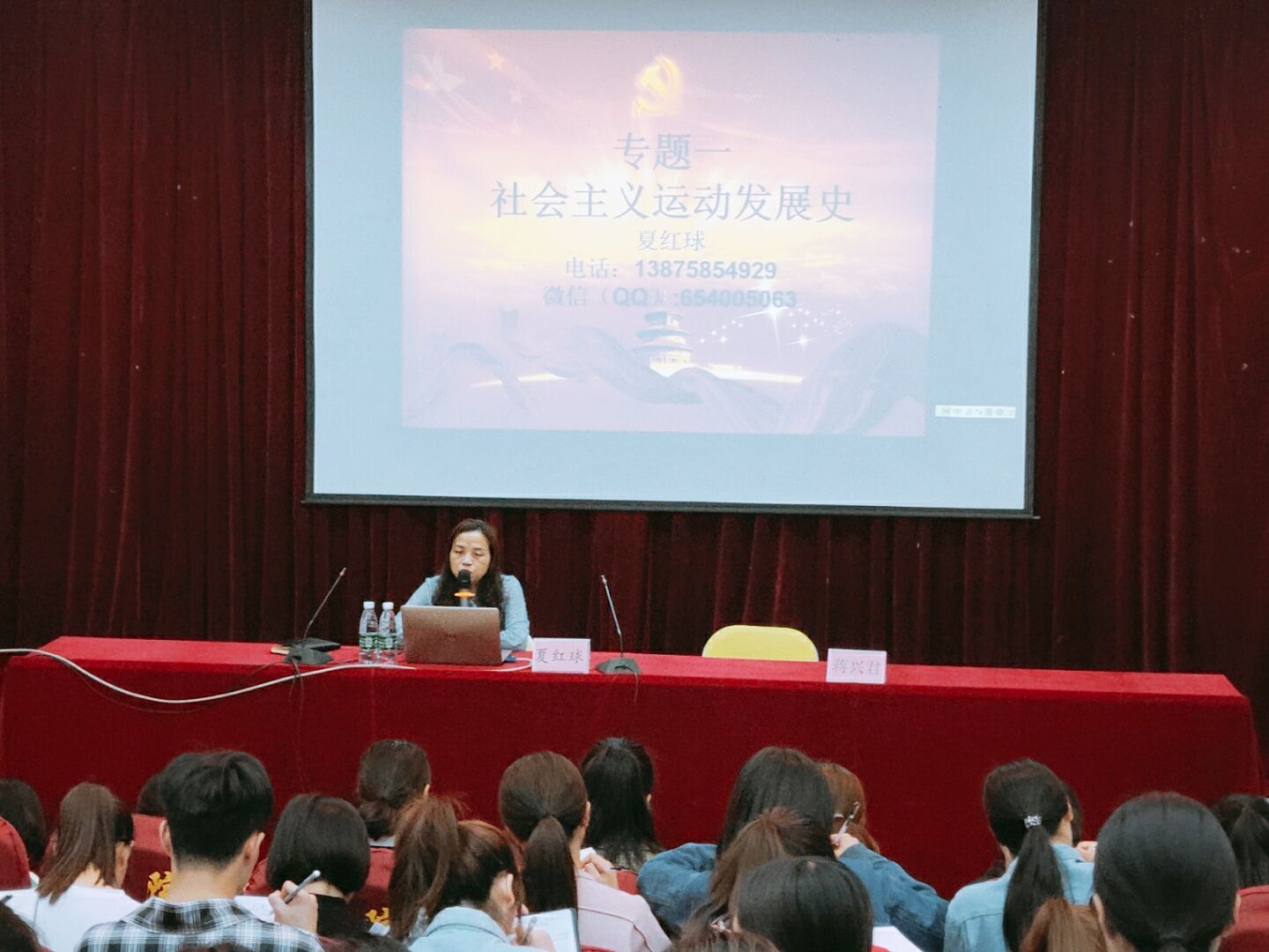开班典礼结束后,由党校副校长、党委宣传部部长夏红球授课为这次培训班的学员上了第一堂党课——《社会主义运动发展史》。在党课中,夏部长为学员娓娓道来,讲述了19世纪中后期的空想社会主义,指出空想主义可以分为三个阶段,以及19世纪初的空想主义者是科学社会主义的直接思想来源;在讲述俄国十月革命和苏联社会主义建设时,重点提出了它的背景、进程和意义,为中国带来了马克思主义,为中国革命指明了正确的方向。通过讲座学员们都深刻意识到"任何历史发展都不是一帆风顺的"。