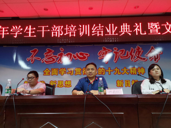 典礼在齐唱国歌、校歌声中拉开序幕,刘克剑等六位学生干部代表,结合各小组学员的培训收获对培训主题“学生干部如何做好表率”进行了成果汇报,学生工作处副处长唐志红宣读了对本次培训班26名“优秀学员”的表彰决定,学生工作处副处长余三明对本期学生干部培训进行了总结。