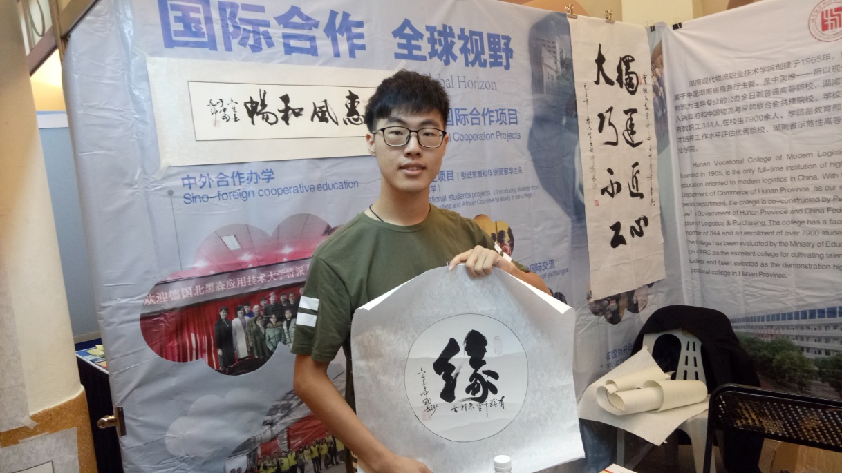 图12-预录我校国际学生代表康旭纶接受书法协会会员赠送作品