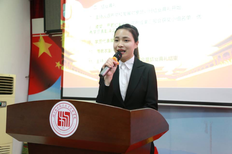 学员代表黄婷发言。黄婷代表全体学员对学校党组织的栽培表达感谢,总结了在党校学习的收获,并向党组织做出庄严承诺:一是严守纪律讲党性,自觉坚守对党忠诚的政治品质;二是持之以恒抓学习,树立“终生学习”的理念;三是牢记宗旨勤为民,牢固树立全心全意为人民服务的宗旨观念;四是埋头苦干创事业,兢兢业业,埋头苦干,奋发进取。