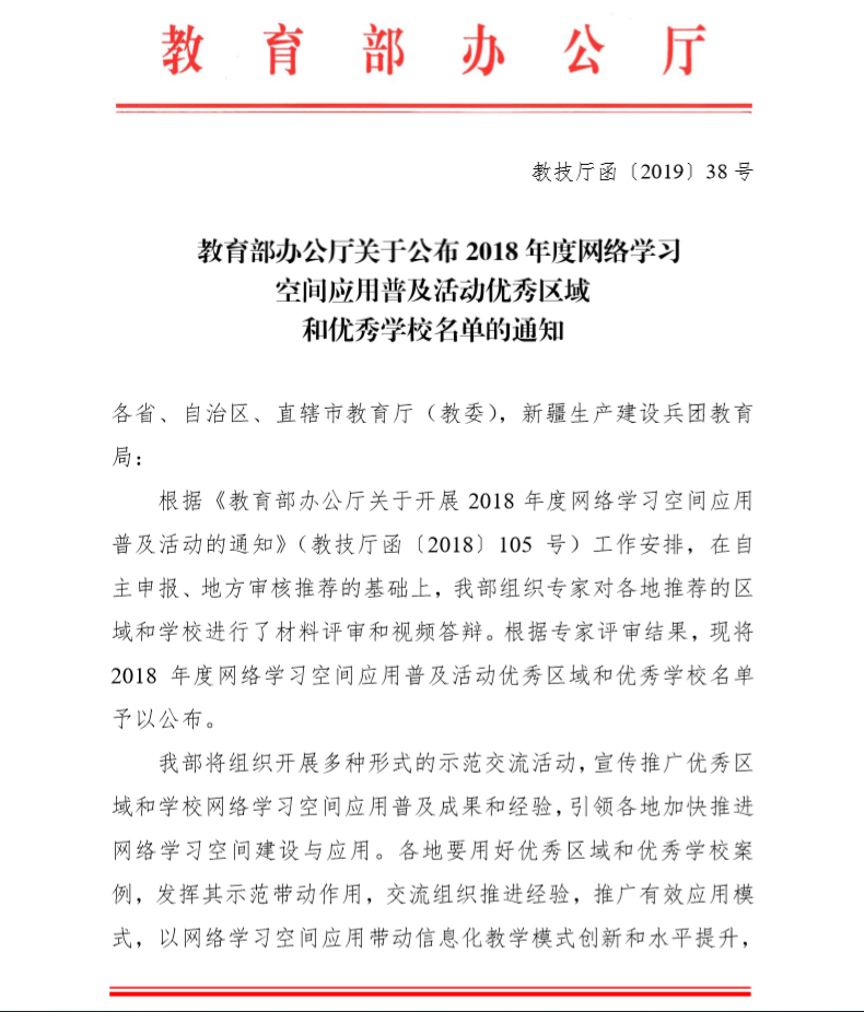 据悉,为深入贯彻党的十九大和全国教育大会精神,落实《教育信息化“十三五”规划》,积极推进“互联网+教育”发展,教育部于2018年10月开展网络学习空间应用普及活动。在自主申报、地方审核推荐的基础上,教育部组织专家对各地推荐的区域和学校进行了材料评审和视频答辩。经过专家认真评审,全国评选出优秀区域若干和优秀学校一批,引导各地加快推进网络学习建设与应用。