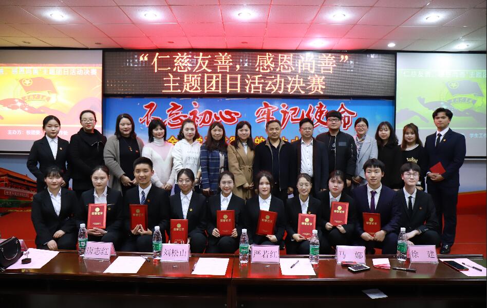 2019年4月3日晚,由校团委、学生工作处主办的“仁慈友爱,感恩尚善”主题团日活动圆满结束,担任本次决赛的评委是党委委员、副校长严若红、学生工作处处长刘松山、校团委书记马娜、学生处副处长唐志红、校团委副书记徐建,现场观摩比赛的还有各二级学院团总支书记、参赛团支部辅导员老师以及200名共青团员。