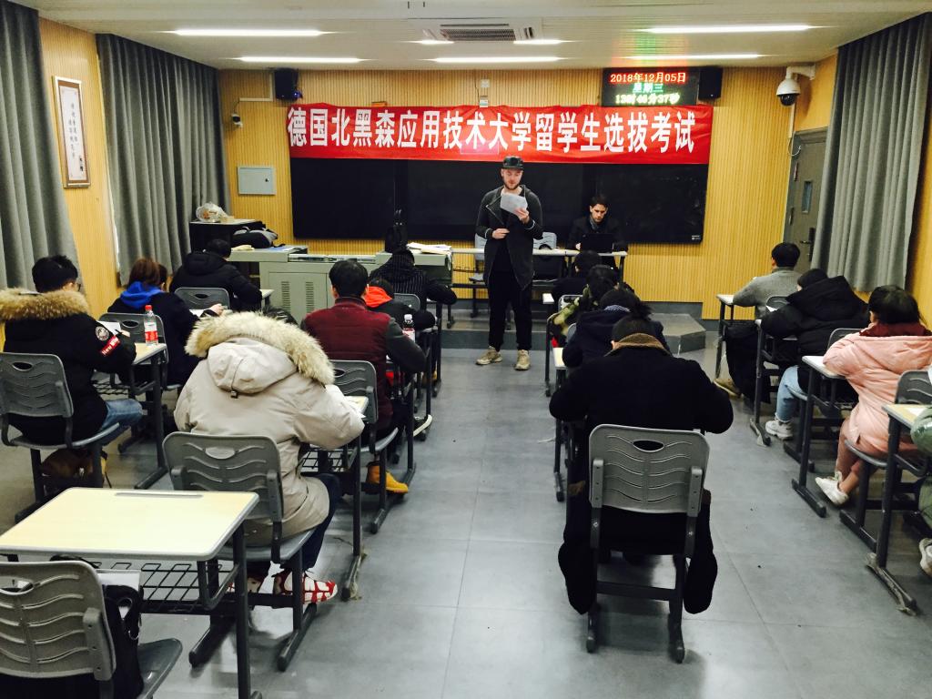 2018年12月5、6日两天,北黑森应用技术大学国际旅游管理&国际办公室主任Stefan Siehl教授和德国杜伊斯堡语言学校Herr Marcel Mochlig教师、德中教育文化交流协会北黑森应用技术大学项目负责人曾凡静老师一行3人来我院举行2019级留学生的入学考试,选拔考试在教学楼111中德教室顺利举行。
