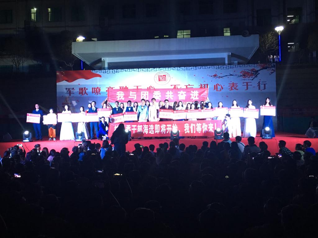 【校团委网讯】2018年9月28日晚7点,由校团委、学生工作处共同主办,各二级学院团总支协办的“军歌嘹亮融于心,不忘初心表于行”——2018级新生合唱比赛决赛在田径场隆重举行。担任此次大赛的评委包括:学校党委书记龙吟,党委副书记周务农,纪委书记胡昌建,党委委员、副校长严若红,党委委员、宣传部部长夏红球,党委委员、组织人事处处长肖勇以及军训总教官郭坤担任评委。同时,学管部门领导、老师、新生辅导员以及2018级全体新生出席了本次活动。