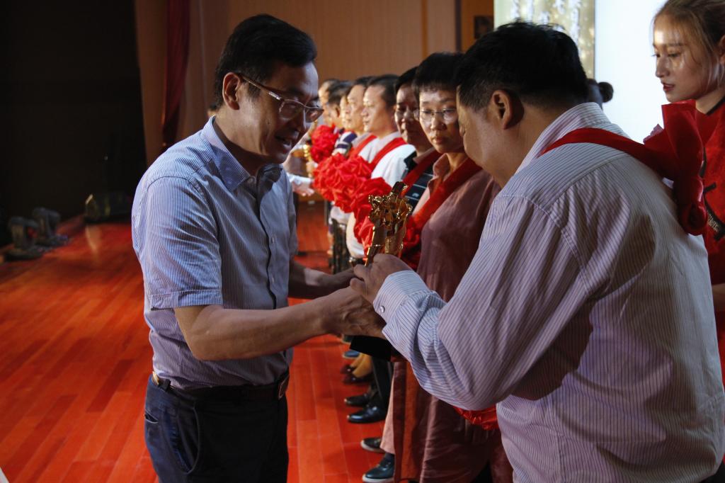 领导给我校教师颁发“辛勤耕耘奖”(左起:第4,龙吟;第6,汤立斌;第11,彭雁峰;第13:黄道安;第17:郭建国)
