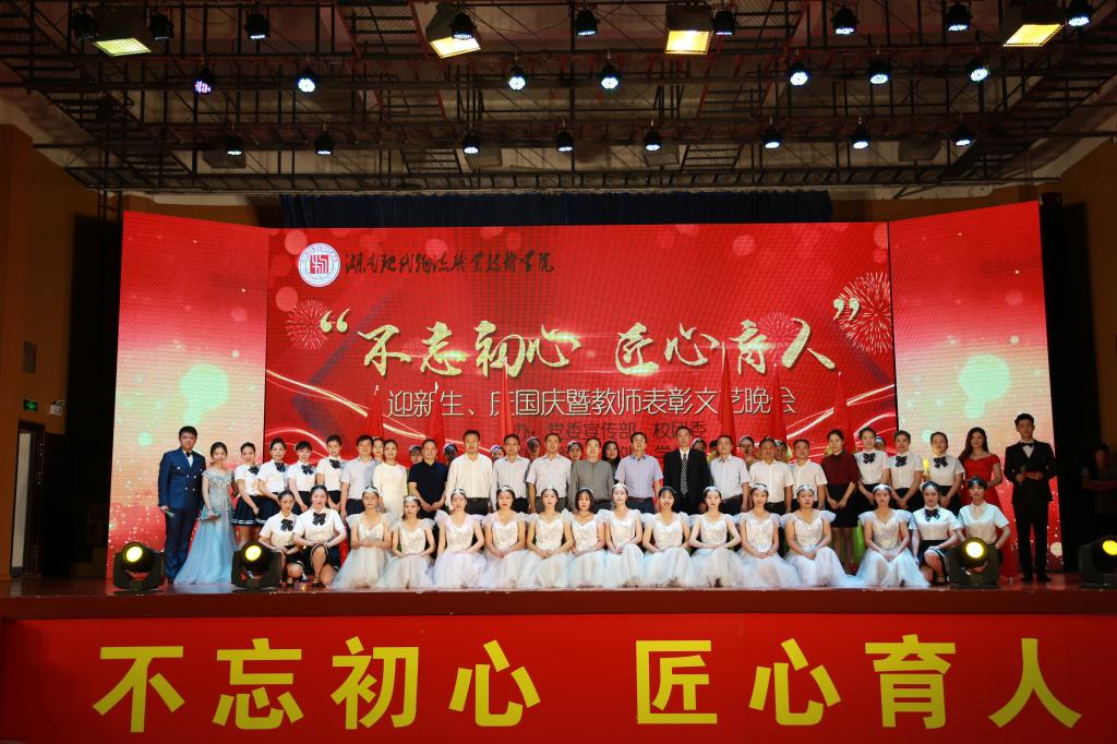 “真心、爱心、不忘初心,诚心、匠心、牢记本心”。9月26日晚,学校举办“‘不忘初心 匠心育人’迎新生、庆国庆暨优秀教师表彰文艺晚会”,共青团湖南省委书记汤立斌、省商务厅巡视员彭雁峰、省委教育工委委员教育厅党组成员郭建国,省综治办专职副主任黄道安、省教育厅教师工作与师范教育处处长邱德、团省委学校部部长王虹彬等应邀出席了晚会。