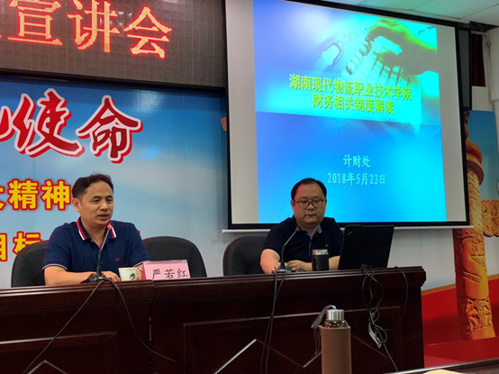 2018年5月23日上午,计财处组织召开了财务制度的宣讲会。党委委员、副校长严若红,计财处全体工作人员、各二级学院(部)负责人、各处室负责人、全体报账员、部分科研项目负责人参加会议,计财处负责人沈鹏主持会议。