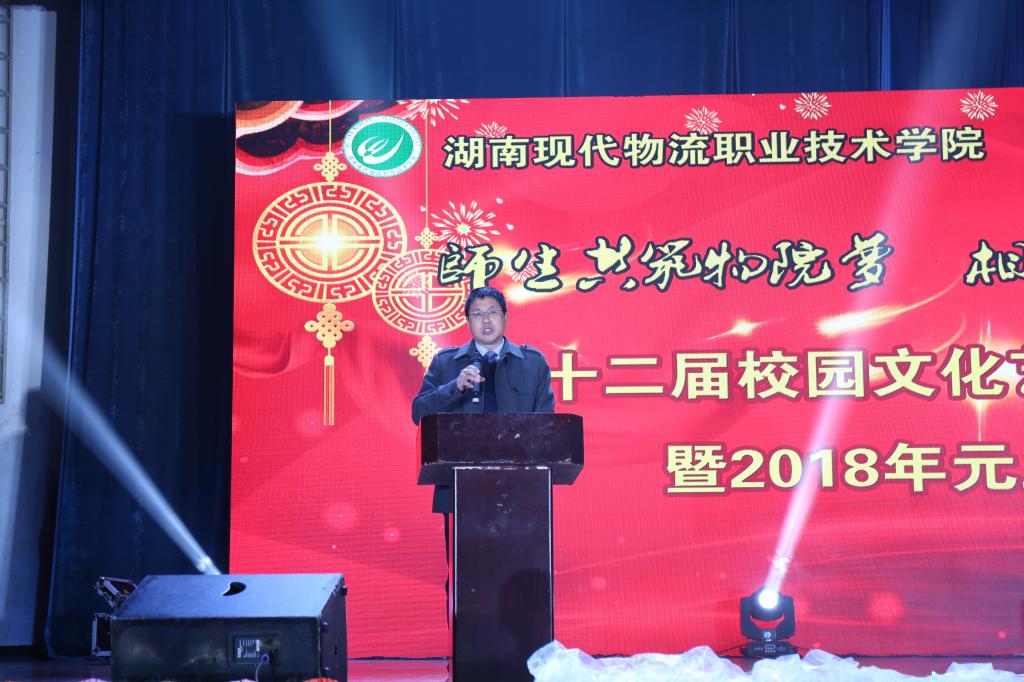【校团委网讯】2017年12月26日19点整,由校工会、校团委主办,物流管理学院团总支承办,校宣传部协办的第十二届校园文化艺术节闭幕式暨2018年元旦晚会在体育馆举行。出席本次晚会的领导包括:党委书记龙吟,副书记、校长邓德艾,党委副书记周务农,党委委员、纪委书记胡昌建,党委委员、副校长彭六生、严若红、陈建华和党委委员、宣传部部长夏红球,组织人事处处长肖勇。同时,到场的嘉宾还有来自湖南安全职院、湖南司法警官职院、湖南水利水电职院、长沙卫生职院等兄弟院校的代表,以及学校各部门领导、老师。