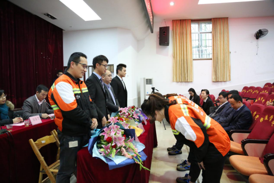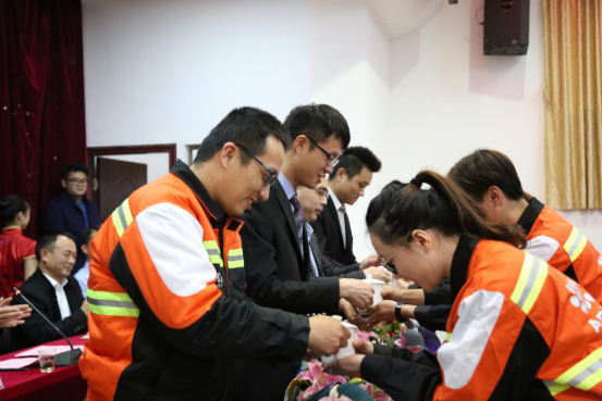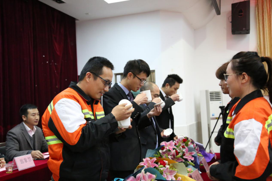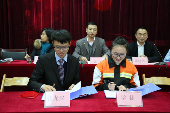 拜师仪式上,学校领导和企业领导分别为企业师傅和学校专业指导老师颁发聘书。学生(徒)按照我国传统拜师礼仪向企业师傅和专业指导老师献花、敬茶并行鞠躬礼,师傅赠予学徒代表《员工手册》,签订师徒协议,师徒结拜礼成。
