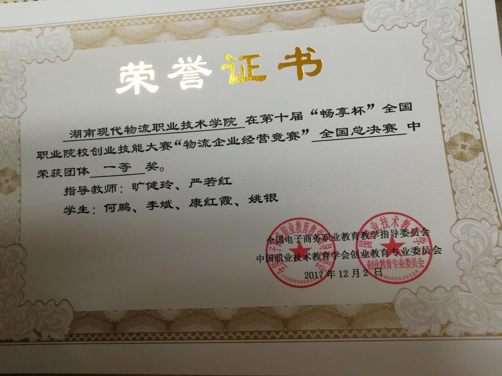 我院旷健玲、严若红老师指导的沙盘爱好者协会四位学生何鹏(企物1604班)、李斌(企物1606班)、康红霞(企物1704班)、姚银(国际物流1701班)代表学院参加了比赛,他们在竞争激烈的赛场上团结一致,沉着冷静,认真思考每一步操作,步步为营,经过一天的浴血奋战后,在本次国赛中力拔头筹,获得小组第一名,荣获本次国赛一等奖,为我院在全国范围内打造品牌做出了自己的贡献。