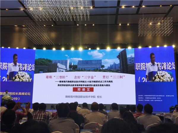 湖南物流职院邓德艾校长受邀在论坛上作题为《着眼 " 三型阶 "、念好 " 三字金 "、贯行 " 三三制 "》的主旨报告。他就物流职院作为国家级物流管理专业 1+X 证书制度试点工作牵头单位,如何推进国家级职业教育教师创新团队建设工作,与大家进行了分享和交流。