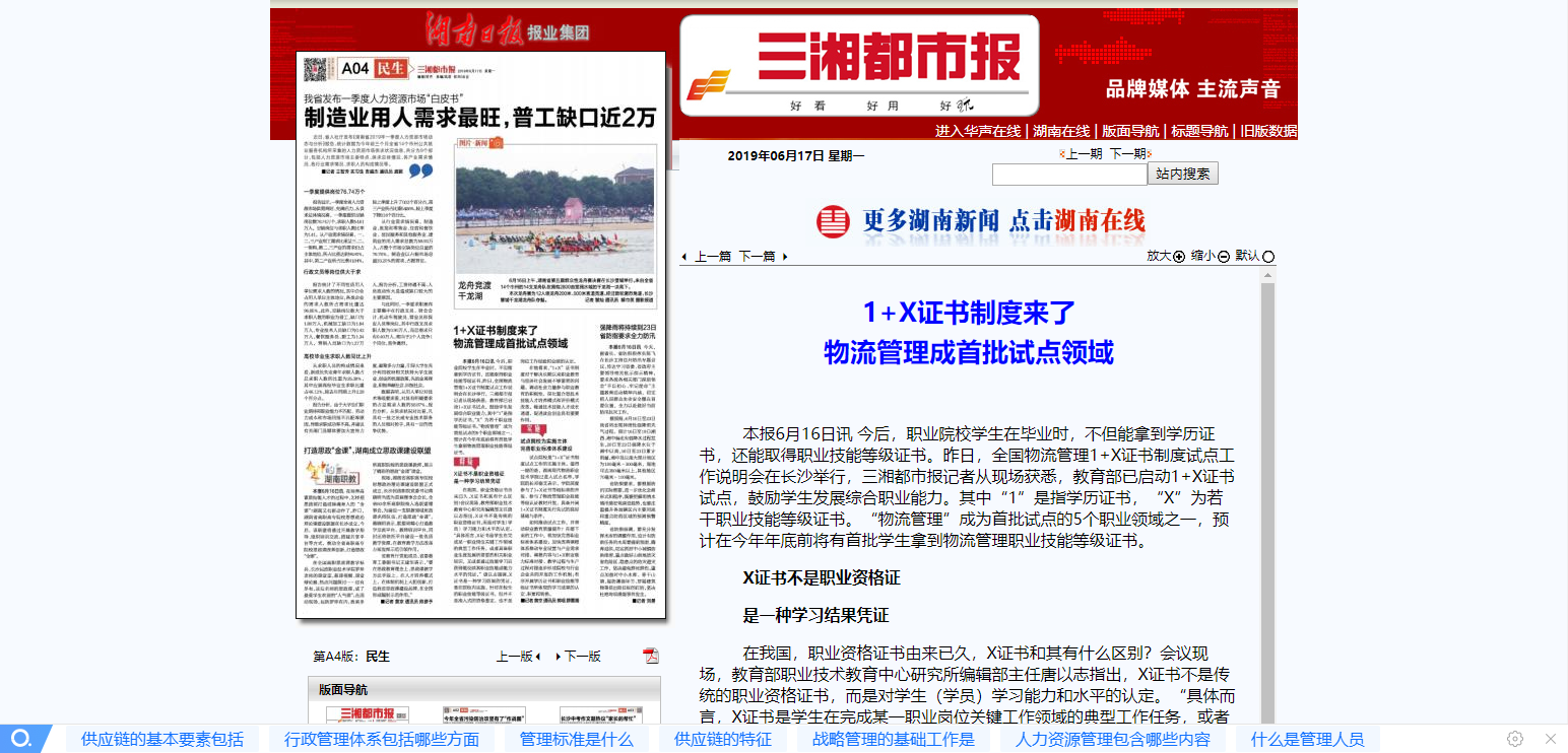 本报6月16日讯 今后,职业院校学生在毕业时,不但能拿到学历证书,还能取得职业技能等级证书。昨日,全国物流管理1+X证书制度试点工作说明会在长沙举行,三湘都市报记者从现场获悉,教育部已启动1+X证书试点,鼓励学生发展综合职业能力。其中“1”是指学历证书,“X”为若干职业技能等级证书。“物流管理”成为首批试点的5个职业领域之一,预计在今年年底前将有首批学生拿到物流管理职业技能等级证书。