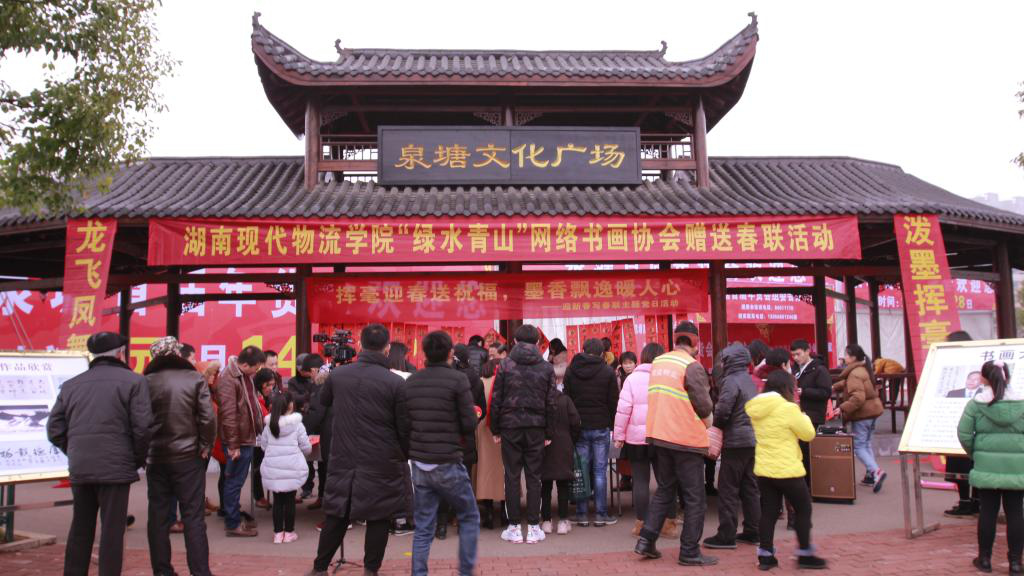 " 一帆风顺全家福,万事如意满门春 "、" 花开富贵重重喜,运转乾坤步步高 "…… 一副副春联,一张张福字,饱含着物流职院师生对社区居民的热情祝福。日前,华亿在线团委与长沙县泉塘街道文化站共同主办、校 " 绿水青山 " 书画爱好者协会承办的 " 泼墨挥毫送温暖,龙飞凤舞迎新春 " 免费为泉塘居民赠送春联活动在泉塘文化广场举行。 协会指导老师、湖南省直、长沙市书法家会员、副校长彭六生,协会指导老师、国际合作学院党总支书记李烁,德风国学社指导老师、党委宣传部副部长欧阳昌雄,校团委全体成员以及街道相关领导均参与到此次活动。