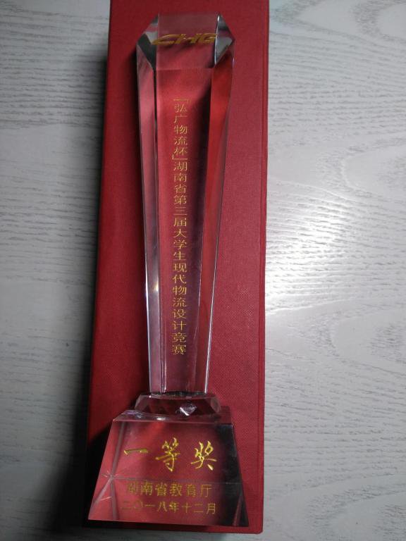 △一等奖奖杯" 弘广物流杯 " 湖南省第三届大学生现代物流设计竞赛是由湖南省教育厅举办、湖南商学院承办、湖南省高等教育学会物流教育专业委员会与长沙恒广物流有限公司协办的省级一类赛事。参赛院校主要为全省具有物流管理与物流工程类等相关专业本科招生资格且有在校学生的高校,全省共有 58 支队伍参赛,23 支进入决赛,设一等奖 9 个,物流职院是全省唯一一所受邀请参赛的高职院校。