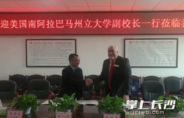 长沙晚报掌上长沙3月30日讯 (通讯员 邓颖颖 记者 徐媛) 3月28日上午11点,美国南阿拉巴马州立大学分管国际事务副校长理查德·卡特博士、美国教育科技国际公司总裁黄晓菲等一行六人到访物流职院进行国际合作项目洽谈。该校副校长陈建华、国际合作学院院长谢小艳等热情接待了理查德·卡特博士一行。双方就语言认证、课程认证、学分互换、课程体系等方面展开了探讨。会上,双方签订了合作办学谅解备忘录,理查德·卡特博士还与学校人文艺术学院商务英语专业12位学生代表进行了交流。