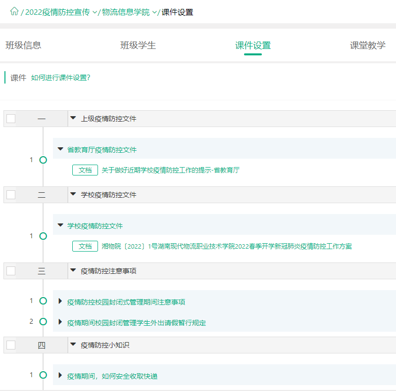 该线上课程设计了上级疫情防控文件、学校疫情防控文件、疫情防控注意事项以及疫情防控小知识四个模块,其目的就是让学院全体师生能及时学习上级疫情防控文件、决策指示,加大疫情防控宣传。