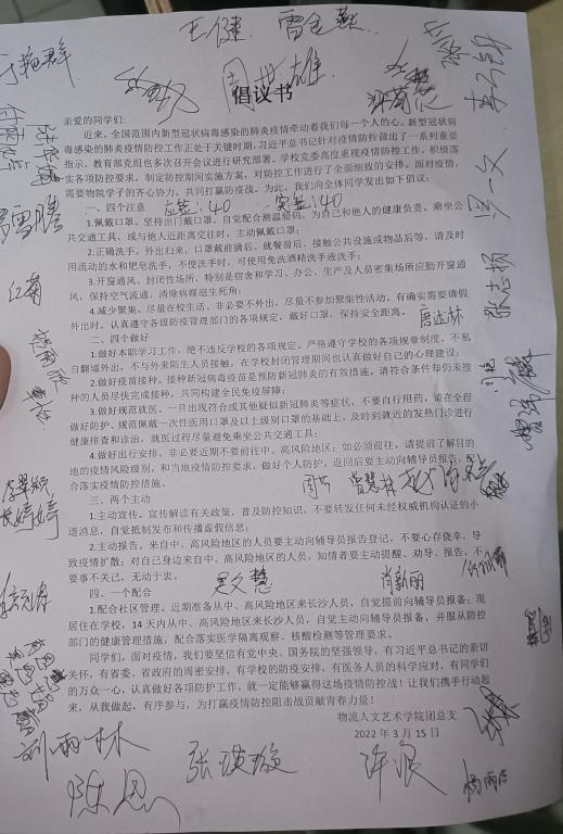 近期,全国范围内疫情多发频发,防控形势复杂严峻,牵动着我们每一个人的心。新型冠状病毒感染的肺炎疫情防控工作正处于关键时期,习近平总书记针对疫情防控作出了一系列重要指示,教育部、省教育厅多次召开专题会议,学校党委将疫情防控作为当前重中之重工作,每日组织相关部门人员专题研判学校疫情防控并进行相关部署。物流人文艺术学院团总支为进一步落实个人防控责任,让人人自觉参与防控,于3月15日向人文院全体同学发起抗疫倡议。