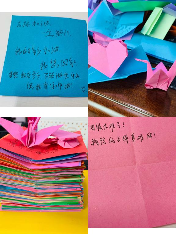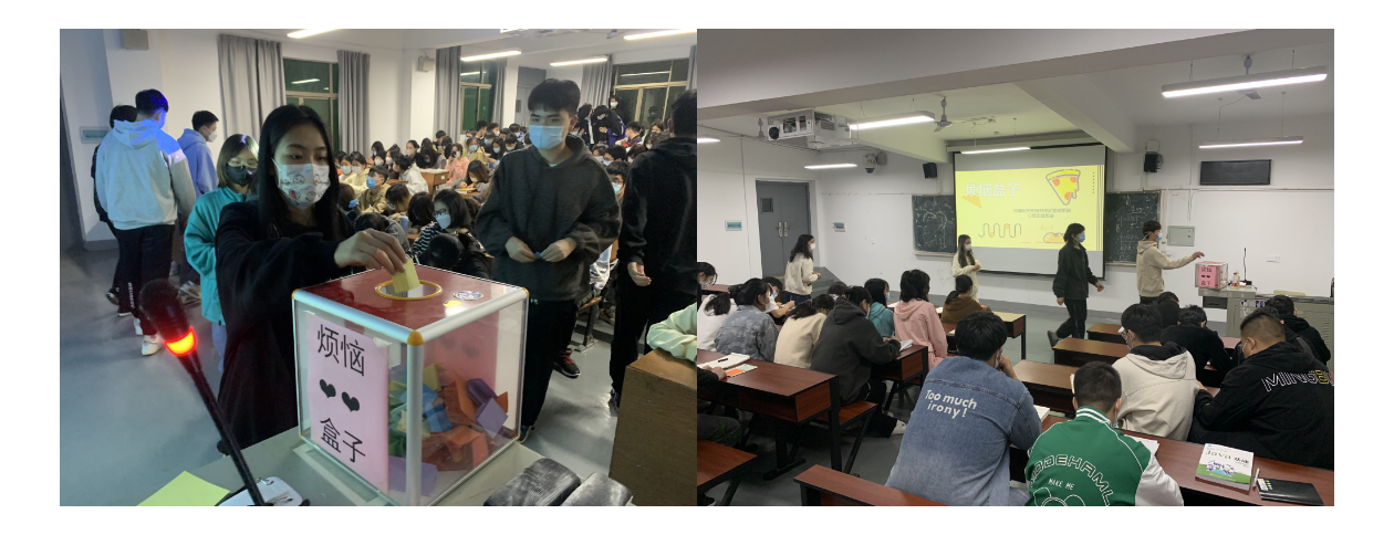 “烦恼盒子是一个具有魔力的盒子,它能把大家的心中烦恼全部收走,剩下的就都是快乐!现在,请纸条在写上自己的烦恼,也可以是吐槽,也可以是自己在这段时间的感想和心愿,放到我身边的这个盒子里来”。本次班会活动的发起人雷瑶组织学生说到。很快,烦恼盒子就被五颜六色的纸条所塞满。最后,雷瑶播放了两位吉林大学学生所剪辑的抗疫视频,以此激励学生保持一个积极向的心态,并提高自己的政治站位和大局意识。遵守学校的疫情防控管理规定,不要私自外出,做好自身心理建设,和国家、学院一起为疫情攻坚贡献力量。