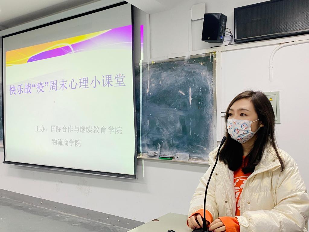2022年3月20日19:00,国际合作与继续教育学院联合物流商学院,在教学楼200教室举行疫情期间周末心理小课堂活动,旨在针对当前阶段学生心理方面集中性存在的问题进行讲解,并在学校封闭式管理期间丰富学生周末生活,加强对学生的心理疏导。物流商学院院长刘意文出席此次活动。本次活动由物流商学院团总支书记李芳主持,国际合作与继续教育学院党支部书记马娜主讲。来自商学院、国继院和物工院共计126名学生参加。