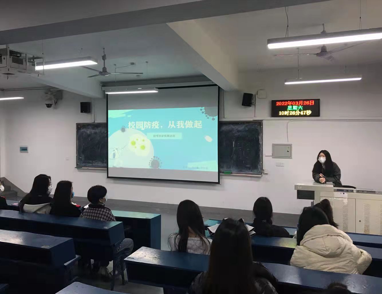 科学防疫,预防为先。首先由自考协会范秋霞进行防疫知识普及,她从了解新型冠状肺炎、我校疫情防控相关措施、疫情期间的个人防护等三个方面解说与新型冠肺炎有关的问题与疑惑,同时提醒大家做好个人防护,戴口罩、勤洗手、少聚集等,牢固树立“每个人都是自己健康第一责任人”的念;提醒大家严格遵守学校“封校管理”制度。