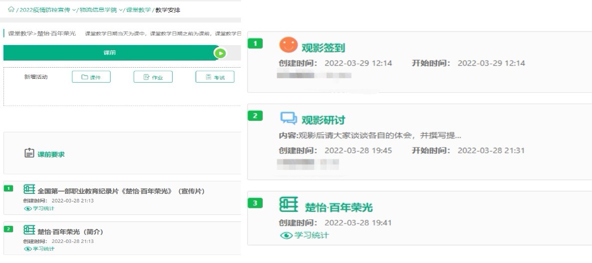 为组织好本次线上集体观影活动,学院通过学校网络学习空间开展线上观影课堂,在该课堂设置了课前和课中两个环节,课前添加了有关《楚怡·百年荣光》纪录片的文字介绍和宣传短片,让老师对《楚怡·百年荣光》有一定的了解,课中添加了影片的观影网址并组织了在线研讨。
