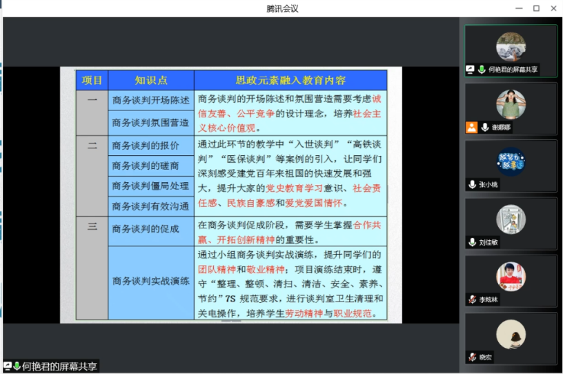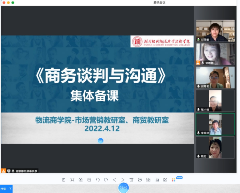 2022年4月12日晚,市场营销教研室联合商贸教研室,就专业核心课程《商务谈判与沟通》在腾讯会议进行在线集体备课活动。首先,何艳君、谢重娜、刘佳敏三位任课老师就授课计划安排、教学重难点以及思政教学点发表了各自观点及实施设想。市场营销教研室李炫林老师和商贸教研室张小桃老师、赖霞红老师都给予了深入细致的点评,同时也对以此课程参加今年教师教学能力比赛的团队提出了宝贵意见。