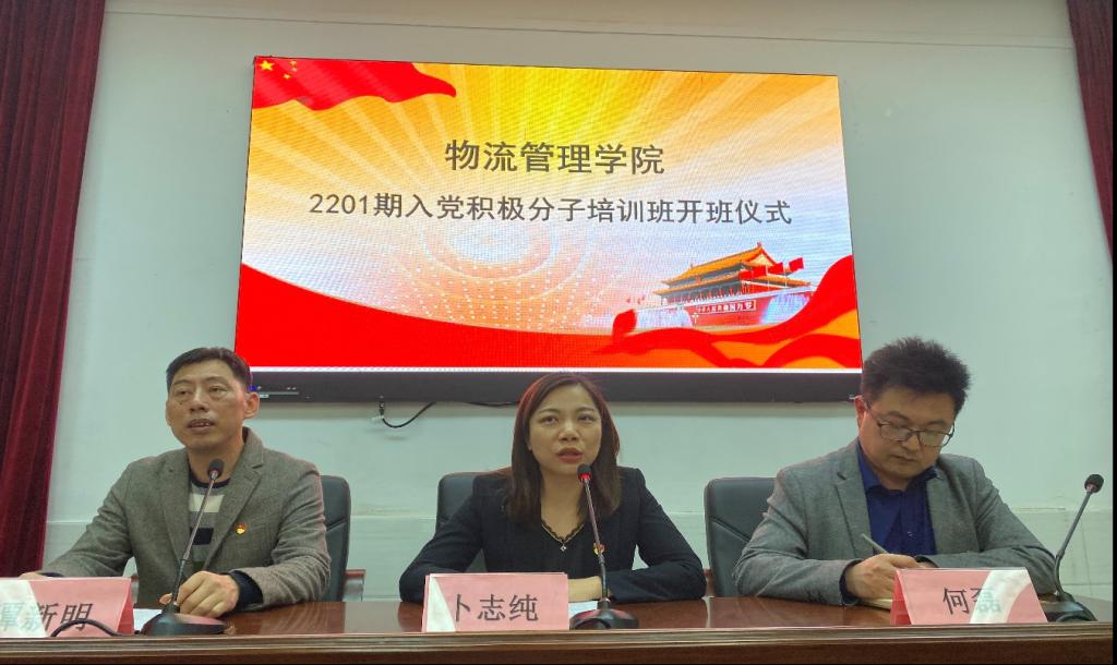 5月10日,物流管理学院在图书馆学术报告厅举行2201期入党积极分子培训班开班仪式,由学生支部书记何磊主持,出席本次开班仪式的有物管学院党总支书记卜志纯、党总支纪检委员谭新明及学生支部所有党员老师。