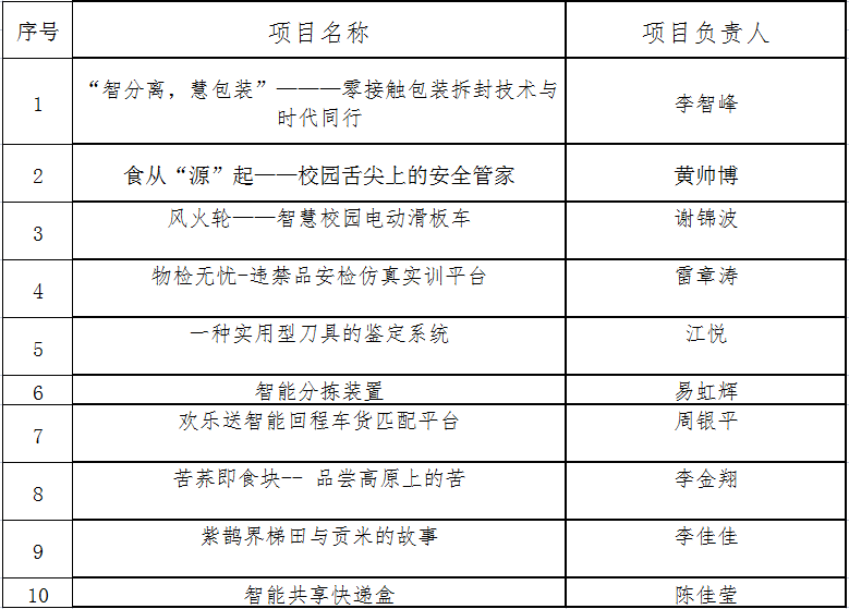 本次院赛进一步激发了同学们参与比赛的积极性,提升创新精神和创业意识,营造创新创业大赛的良好氛围。我院将结合专业实际,认真开展工作,争取获得优异的成绩。经院内外评审专家评定,推荐以下10个项目代表学院出战校赛: