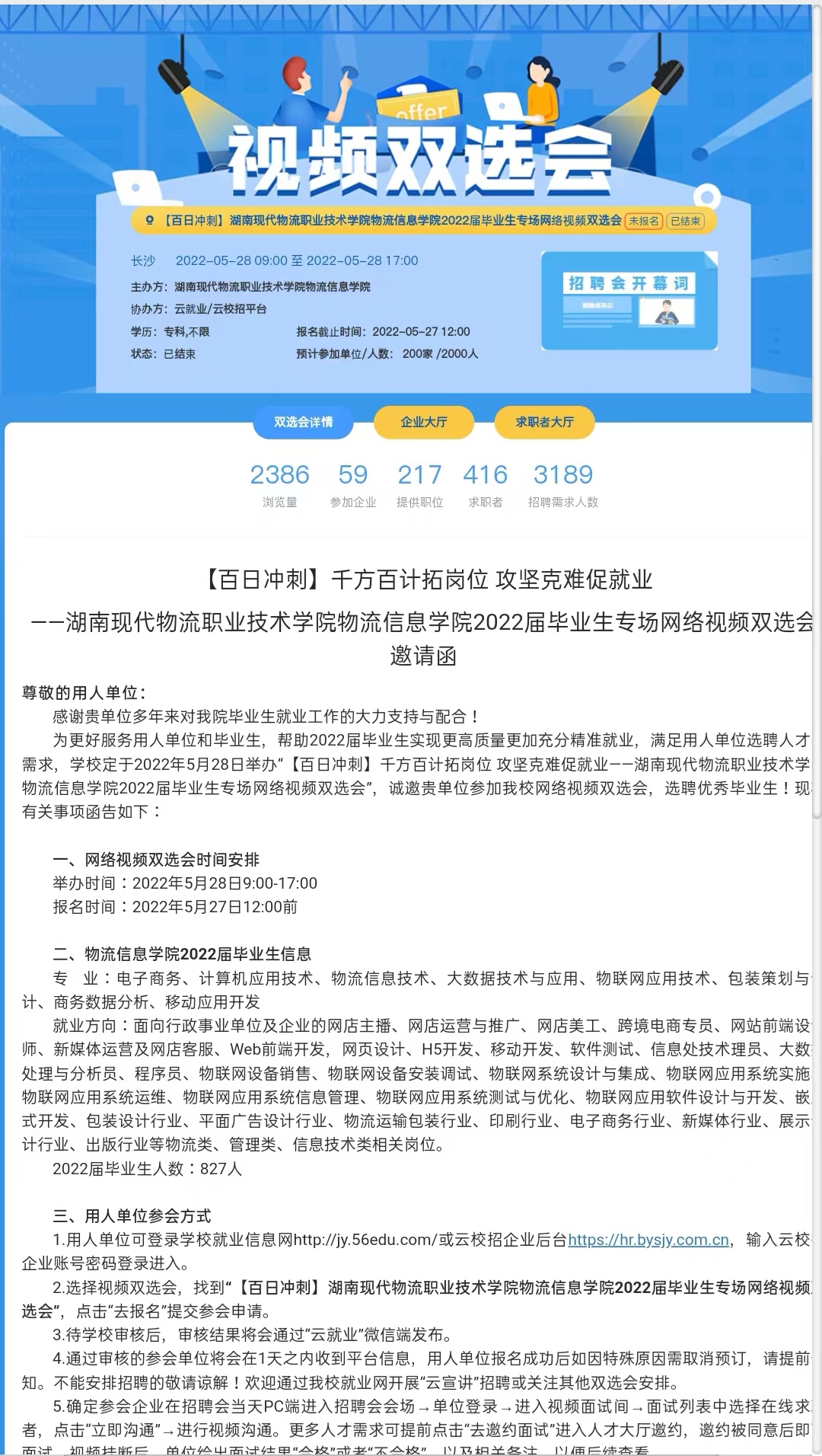本次网络视频招聘会参会单位59家,提供职位217个,岗位3189个。包括中国核工业二三建设有限公司、华道数据股份有限公司、湖南绿叶水果有限公司、苏州方正融合通信服务有限公司、中国平安人寿保险股份有限公司、湖南湘邮科技股份有限公司、湖北顺丰运输有限公司、中铁上海工程局集团物资工贸有限公司、长沙一汽汽车有限公司等众多知名企业,岗位包括物流管理、信息技术、电子商务、计算机应用、大数据等类型,需求涵盖我院所有专业。截止目前,已有197人投递了简历,初步达成意向的有35人。
