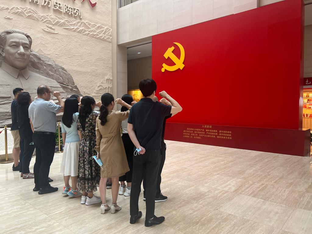 随后,在党史陈列馆一楼入馆大厅,面对庄严的党旗,由支部书记梁飞领誓,全体党员重温了入党誓词。