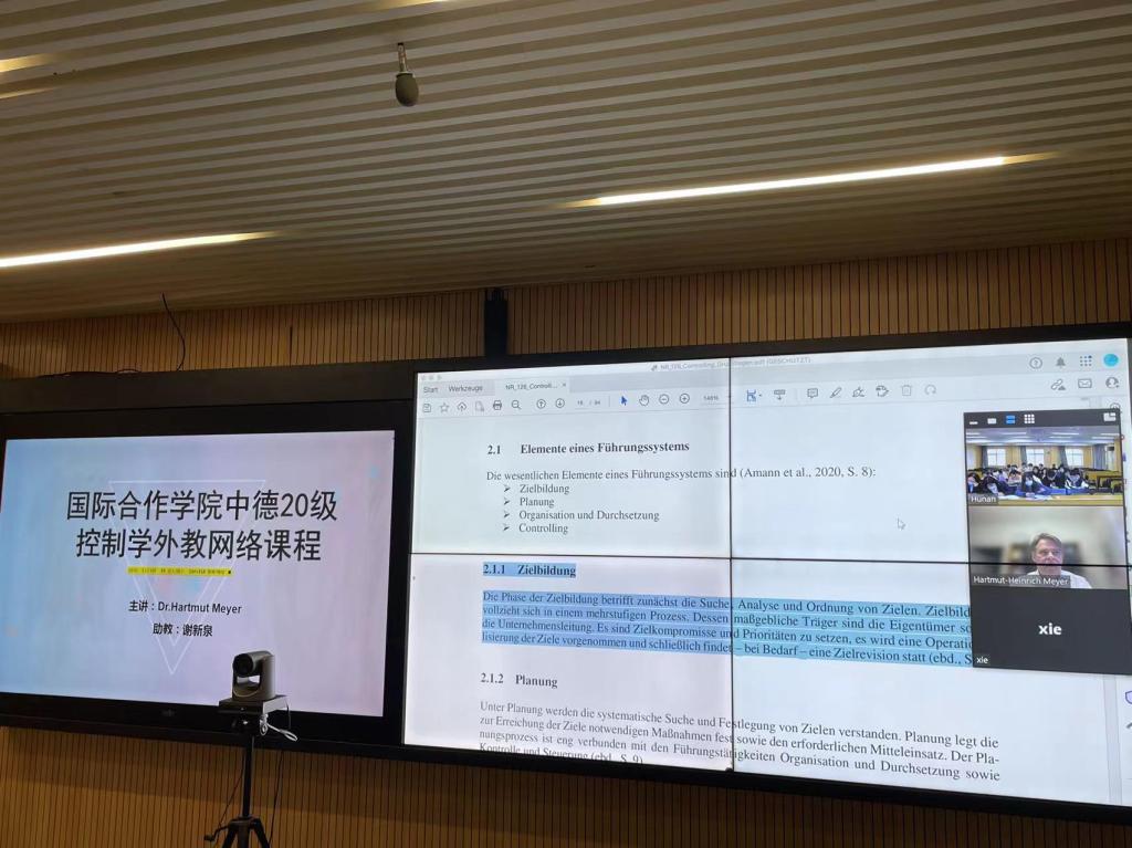 Dr.HartmutMeyer先生对学院全力以赴为师生提供优质服务,保障网络课程顺利进行表示感谢,他希望学院也及时反馈学生学习效果,共同努力做好课程讲授。随后Dr.HartmutMeyer为全体中德20级学生进行控制学课程授课。