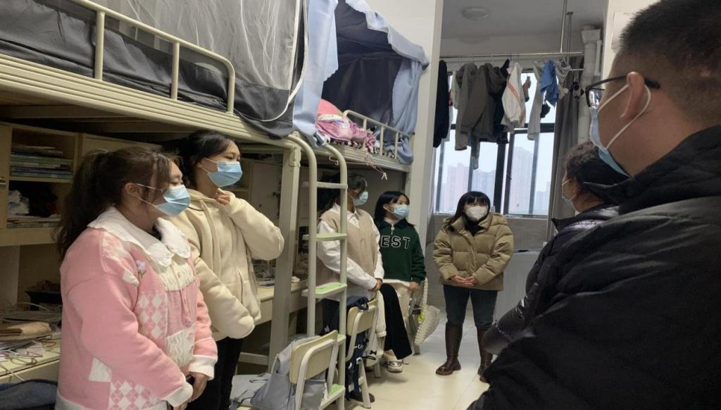 在学校疫情防控期间,为关怀学生在校时的精神状况和学生们的寝室生活环境,2022年12月6日下午17时,物流商学院党总支书记储昱、学生干事郑朴生、辅导员李芳、何莉洋、龚君豪、陈珊等老师深入学生寝室,了解学生们的寝室生活和心理情况。