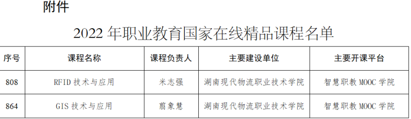 近日,教育部公示了2022年职业教育国家在线精品课程遴选结果,我院院长翦象慧副教授申报的《GIS技术与应用》和米志强教授申报的《RFID技术与应用》两门课程全部入选。