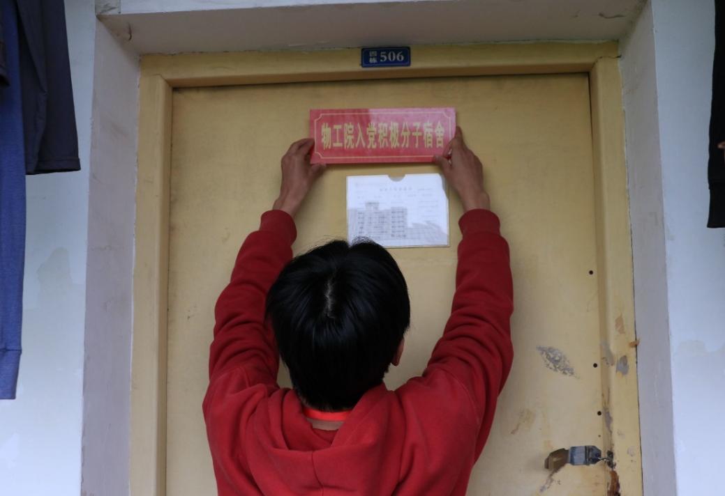 本次共有19个宿舍需要进行挂牌,首先,物流工程学院学生思想政治工作委员会主要干部于宿舍楼前集合完毕后一行人首先前往11栋504宿舍为其挂牌,该宿舍共八名同学,四人为入党积极分子,是一个优秀的模范宿舍。梁林飞老师认真地询问同学们在宿舍的生活以及平时整理内务的情况,随后在查看了该宿舍平时内务检查成绩后提出相关意见和建议。物工院思政分会主任刘应潭强调:入党积极分子是一个先进、优秀的群体,寝室门上挂牌,是提醒大家要时刻以一名优秀党员的标准严格要求自己,要主动发挥入党积极分子在学习、生活、工作等方面应起到的模范带头作用,以此带动全体同学共同进步。