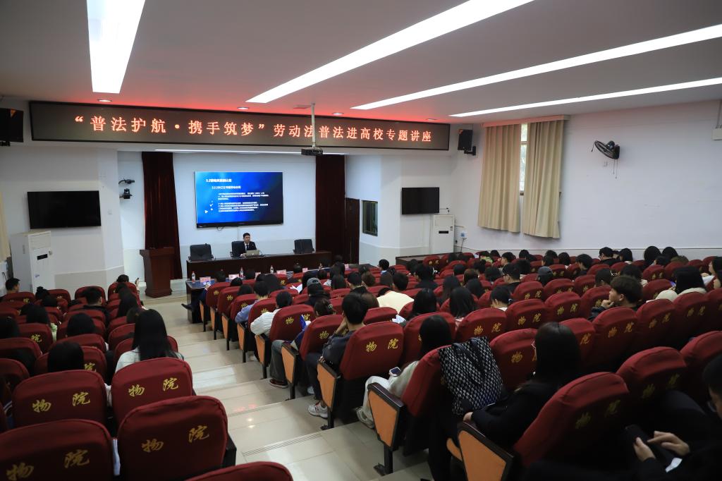 为方便学生们进一步解劳动者的权利和义务、增强自我防范能力、避免就业陷阱,学会利用法律武器维护自身的合法权益,4月25日下午,物流信息学院邀请长沙市总工会、长沙市律师协会及湖南金州律师事务所在学术报告厅进行了以“普法护航,携手筑梦”为主题的公益法律大讲堂。本次讲座特邀长沙市律师协会人力资源和社会保障专业委员会副主任黄宝平和湖南省总工会专项服务律师钟志勇作为主讲嘉宾,长沙市律师协会监事何迎建、湖南金州律师事务所人保委主席袁高凤、物流信息学院专职辅导员余锦秀、向贤伟、专业老师杨曙及学院100余名即将实习的21级学生参会。此次讲座由湖南金州律师事务所人保委委员蒋秋韵主持。