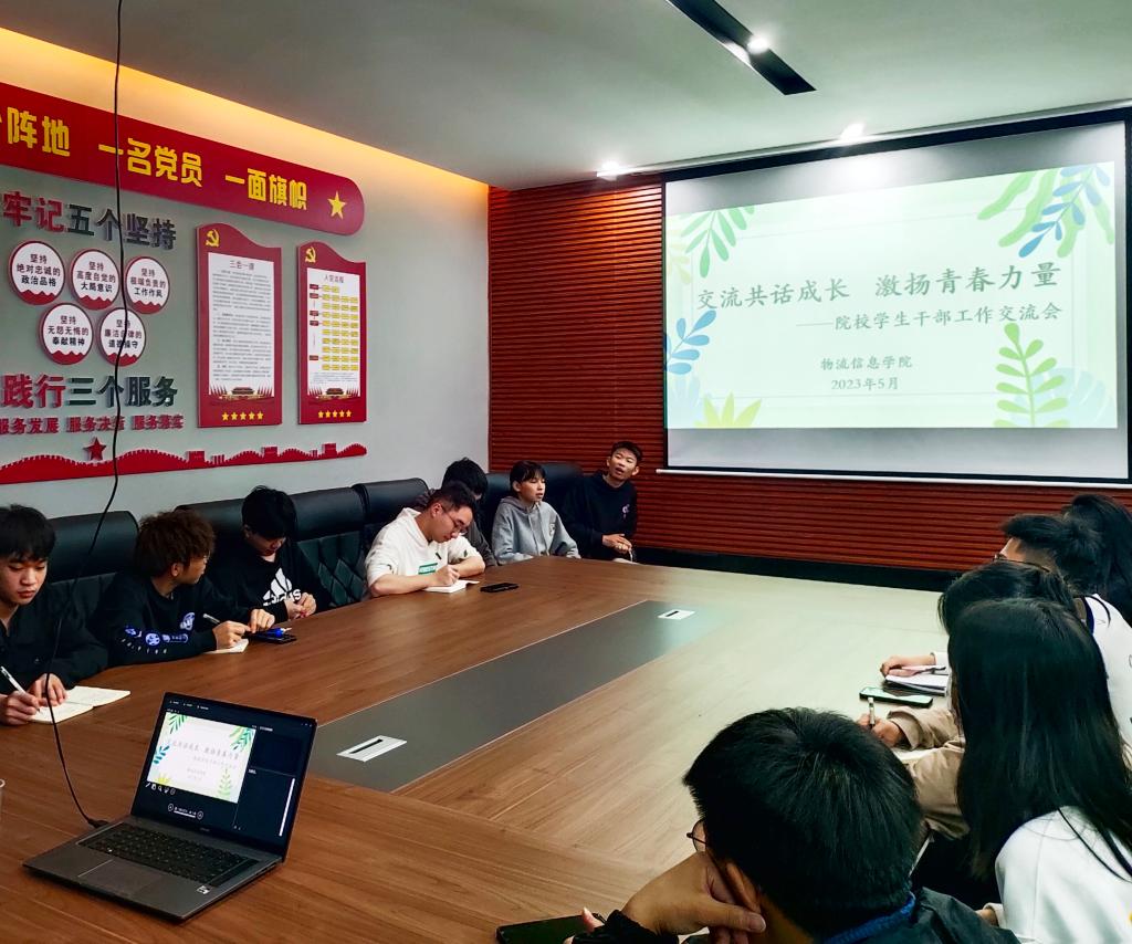 为提升学生干部管理能力,提升学生自我管理水平,促进学生组织之间的互相交流,物流信息学院学生会,团总支,思政分会,宿管会携手校学生会,校思政,校团委,校宿管会,校飞虎营于2023年5月10日在图书馆四楼易班工作站会议室开展院校学生干部工作交流会。