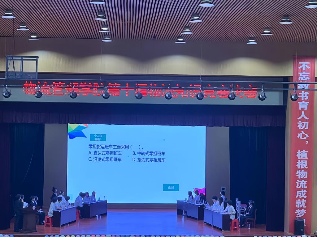 本次决赛共有四个参赛队伍,比赛共分为“有问必答”“争分夺秒”“加分题”三个环节。各参赛选手们在比赛中沉着冷静、配合默契、思路清晰、临危不乱、自信应对,将所学的物流知识灵活运用,向大家展示积极向上,团结合作的良好精神风貌,赢得现场观众的阵阵掌声。