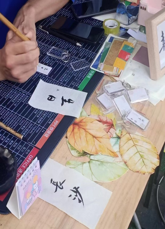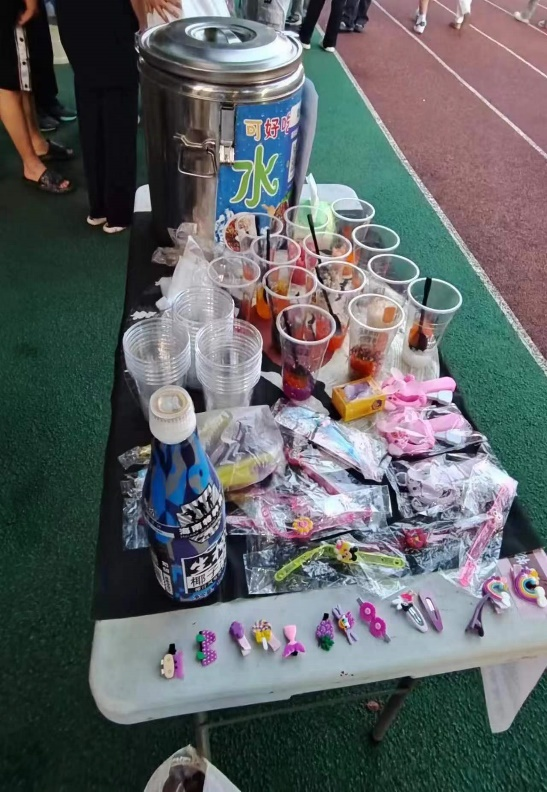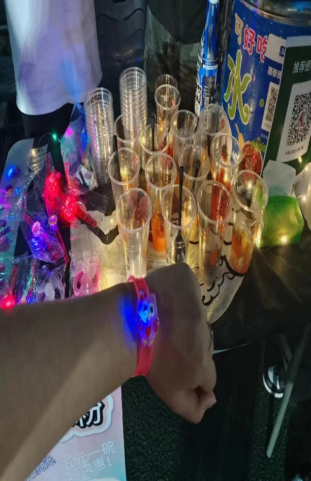 华灯初上,物院足球场边早已人声鼎沸、热闹非凡,同学们迫不及待地支起折叠桌椅,挂出标新立异的招牌,摆好直播设备器材,陈列出琳琅满目的自制特色产品。“5块一杯双皮奶,3块一杯柠檬茶,1块一串的钵钵鸡,3块一个的自创书法钥匙扣,6块6五个圈套盲盒......”15个小摊紧然有序地一一摆放开来。各种水果的清香、钵钵鸡扑鼻而来的诱人香气、精美别致的小商品吸引了大批同学驻足各摊位前或是购买美味可口的食物,或是选购喜爱的小物件。