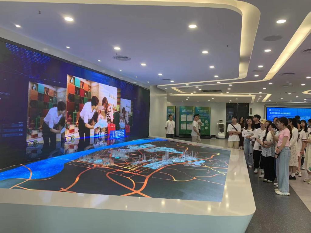 实训示范班在企业负责人的介绍下,参观了新媒体直播产创城,深入了解了晨丰元界直播产创城的企业文化、产业布局和技术实力以及企业的基地状况、课程体系、运营团队、供应链体系、合作品牌等。
