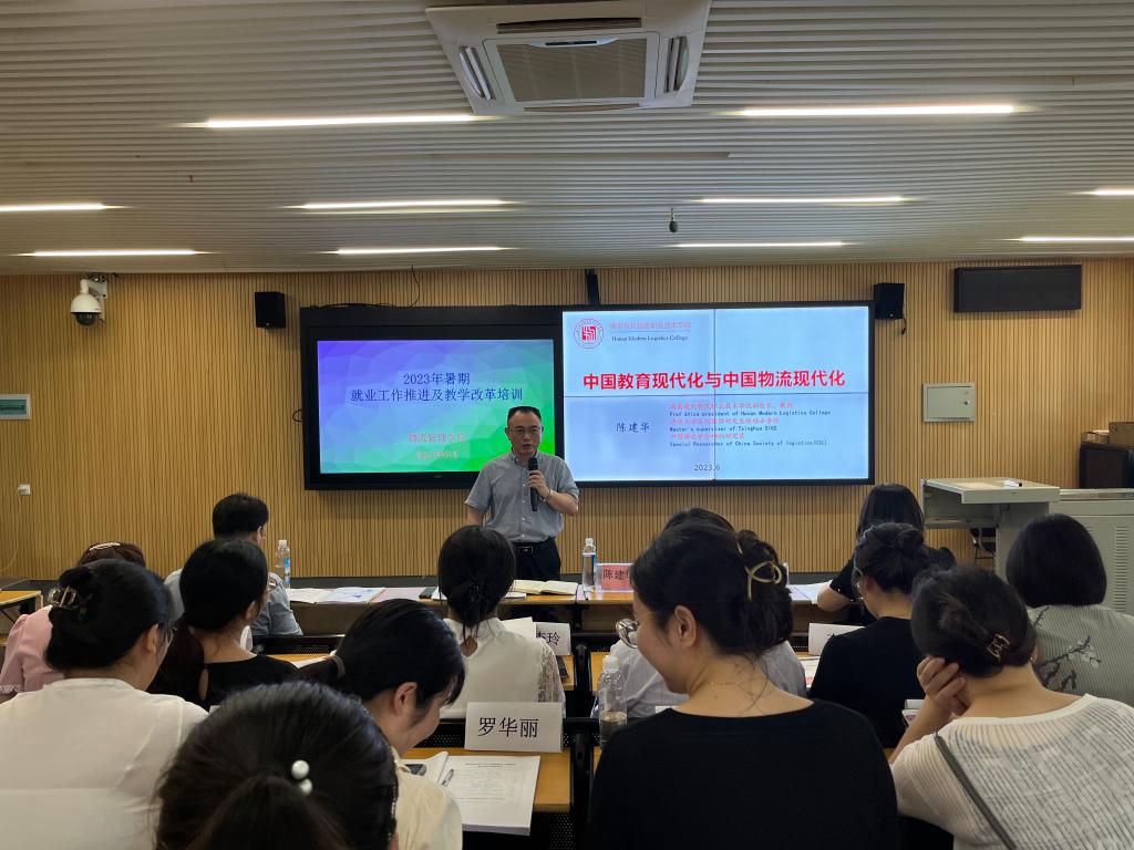 陈建华副校长以《中国教育现代化与中国物流现代化》为题,首先带领大家学习了习近平总书记在中共中央政治局第五次集体学习时讲话精神,引领在座老师深刻理解中国教育现代化内涵,就如何加快建设高质量教育体系结合学校定位阐述了自己的见解;其次就物流现代化现状以及物流职业教育现代化的介绍阐述了物流产业现代化与人才需求;最后对目前中国物流职业教育现代化展开了论述,让参训老师深刻学习领会了现代化建设的内涵与精神。