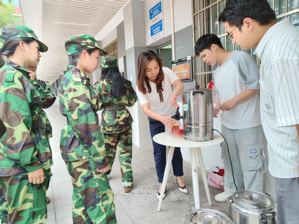 军训如期而至,操场上站满意气风发的少年,烈日炎炎中他们将汗水融进教官的声声口令,在青春坚定眼神中扬起大学的风帆。9月21日,在秋意袭来温度骤降之际,物流管理学院党总支书记卜志纯带领全体新生辅导员为军训中的新生送上秋天的第一杯“暖心”姜茶。