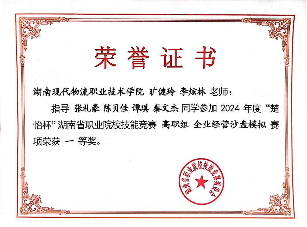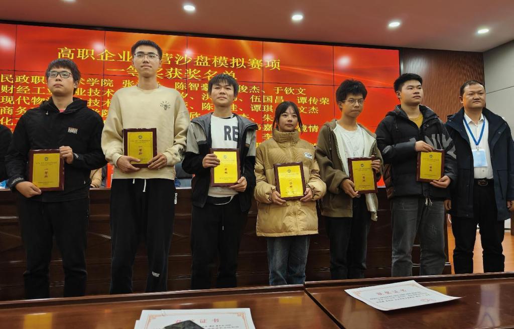 我校旷健玲、李炫林老师指导的沙盘爱好者协会四位学生秦文杰(营销2301班)、张礼豪(营销2301班)、陈贝佳(营销2301班)、谭琪(营销2301班)在竞争激烈的赛场上团结一致,沉着冷静,经过一天的奋战,在此次竞赛中荣获省赛一等奖。