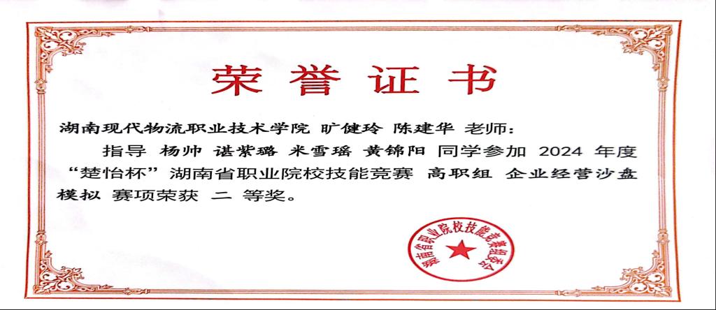 旷健玲、陈建华老师指导的沙盘爱好者协会四位学生杨帅(企物2102班)、谌紫璐(营销2301班)、米雪瑶(营销2301班)、黄锦阳(营销2302班)也在努力奋斗后荣获省赛二等奖。