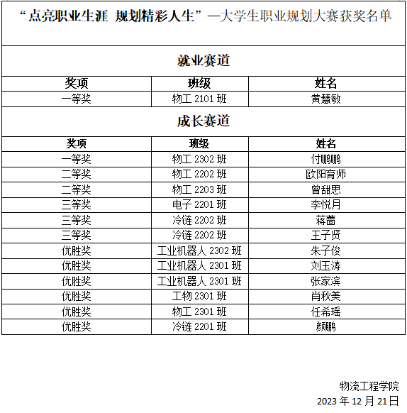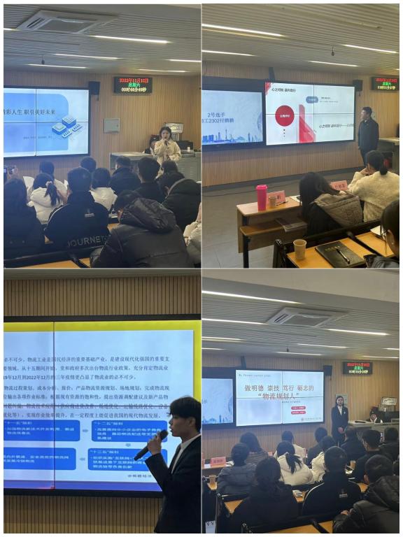 2023年12月21日14:00物流工程学院在教学楼100教室举行大学生职业规划大赛院赛。本次大赛特邀校企合作与就业处副处长李乐、物工院党总支书记刘建辉、院长杜丽茶担任评委。学院党总支副书记高琪昕、团总支书记赵思惠及比赛指导老师和部分学生代表全程观摩。