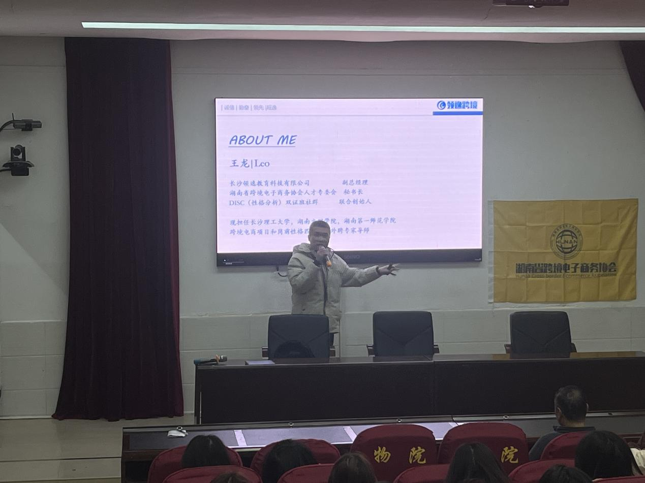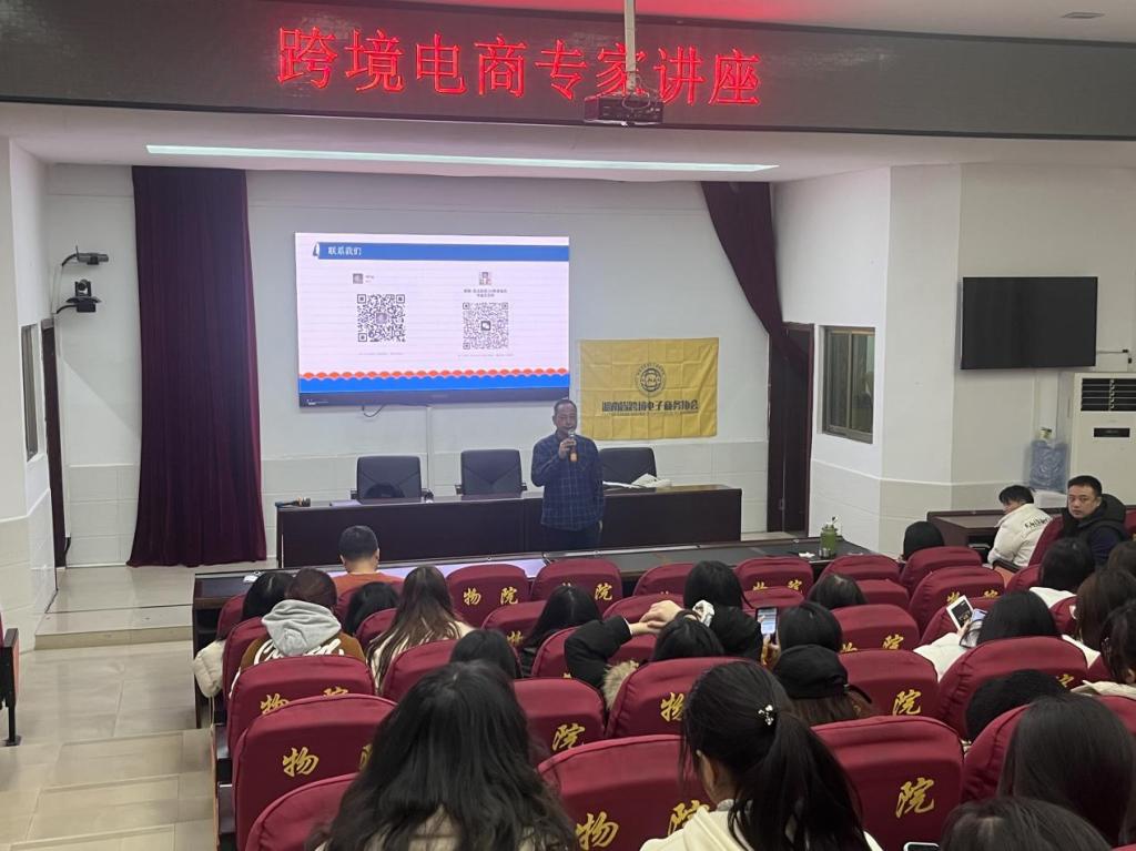 26日上午,物流人文艺术学院跨进电商专业学风建设主题活动在图书馆学术报告厅举行。本次主题活动以“以企带学,跨境初体验”为主题,邀请校企合作单位湖南领逸科技副总经理、湖南省跨境电子商务协会人才专委会秘书长王龙先生对同学们急切盼望了解的一些专业方面的问题从专业和实践的角度进行了深入解答。学院党总支书记、跨境2301、2302班联系班级领导李烁、党总支副书记赖永晖及辅导员易波老师出席本次活动。