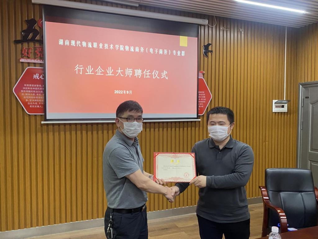 最后,还进行了企业行业大师聘任仪式。聘任京东物流徐金鸿为行业企业大师,为教师教学创新团队的建设,提供最新行业发展动态和经验。